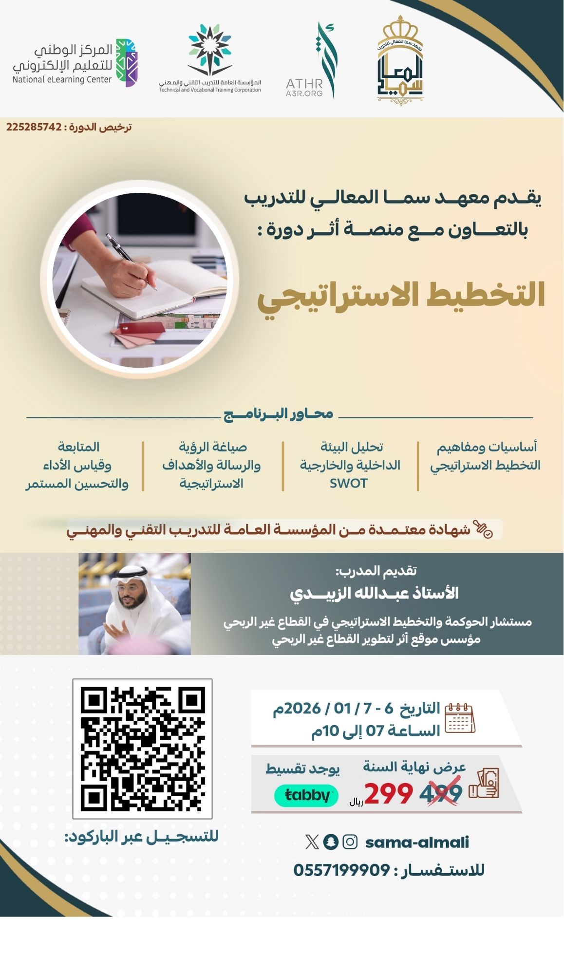 دورة التخطيط الاستراتيجي، والتي تهدف إلى تمكين المشاركين من فهم الأسس العلمية والعملية للتخطيط الاستراتيجي، وبناء خطط فعّالة تسهم في تحقيق الأهداف .